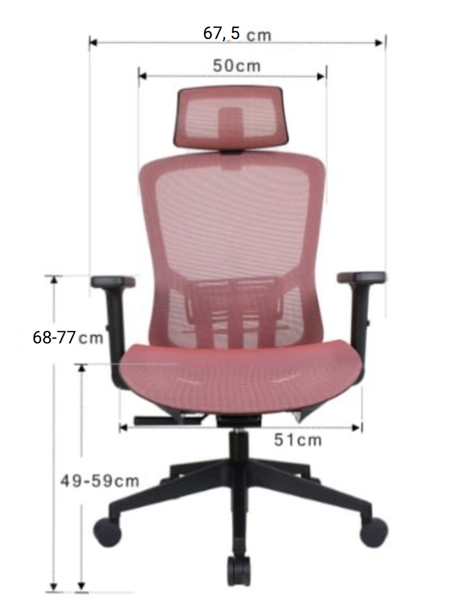 - Регулировки: высота сиденья (49–59 см), высота подлокотников; регулируемый 2D подголовник, регулируемая поясничная поддержка
